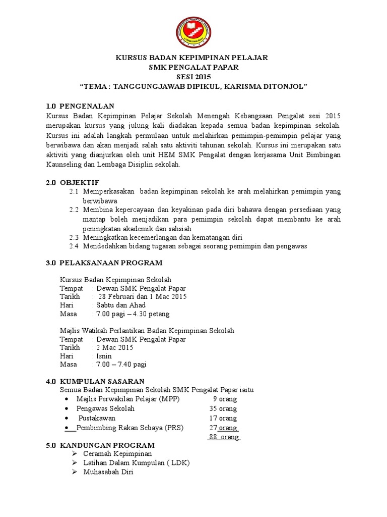 Kertas Kerja Kursus Kepimpinan Pengawas Kertas Kerja Kem Pengawas 26 Orang Pengawas Pusat Sumber Sekolah 5 Mujahid Ah Berbicaras